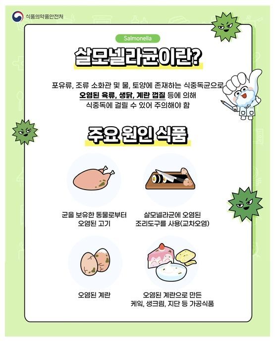살모넬라는 가금류, 포유류의 장 내에 기생하는 병원성 세균으로서 달걀을 만진 뒤 손을 씻지 않고 음식을 조리하거나 다른 조리기구를 만져 생기는 교차오염으로 인한 식중독이 발생하는 사례가 많아 각별한 주의가 필요하다.