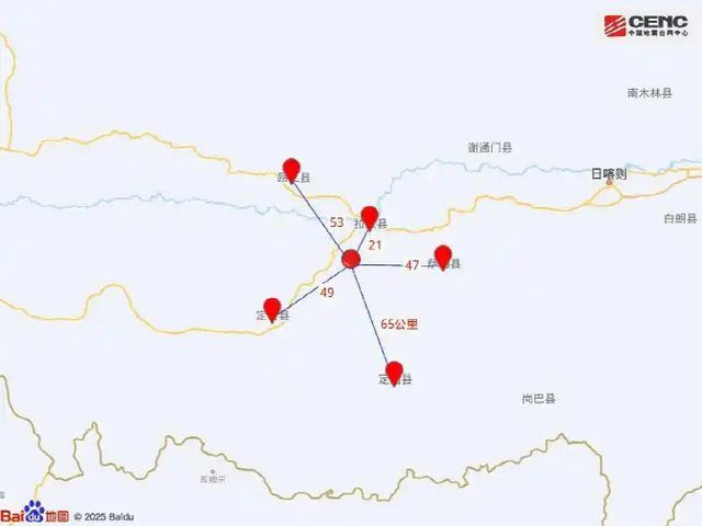진원지는 라쯔현에서 21km, 석가현에서 47km, 딩그리현에서 49km, 앙렌현에서 53km, 딩지에현에서 65km, 시가체시시에서 136km, 라싸시에서 357km 떨어져 있다.