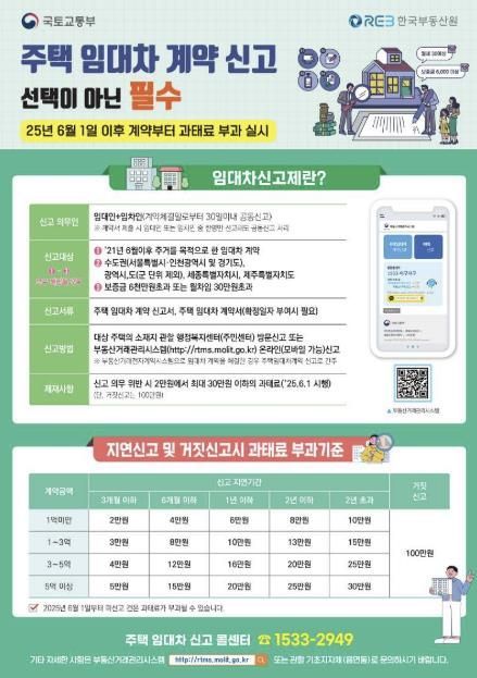 임대차 계약 체결 후 계약 사실을 신고하지 않거나 지연 신고하면 계약 금액과 지연 기간에 따라 최소 2만원에서 최대 30만원의 과태료가 부과된다. 거짓 신고하면 과태료 100만원이 부과된다.