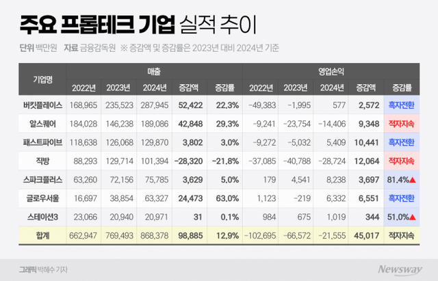 12일 뉴스웨이가 국내 주요 프롭테크(Prop Tech, 부동산 정보기술) 기업 7곳의 실적을 분석한 결과, 지난해 합산 매출(연결기준)은 전년대비 12.9%(988억원) 증가한 8683억원을 기록했지만 합산 영업이익은 3년 연속 적자를 기록한 것으로 집계됐다.