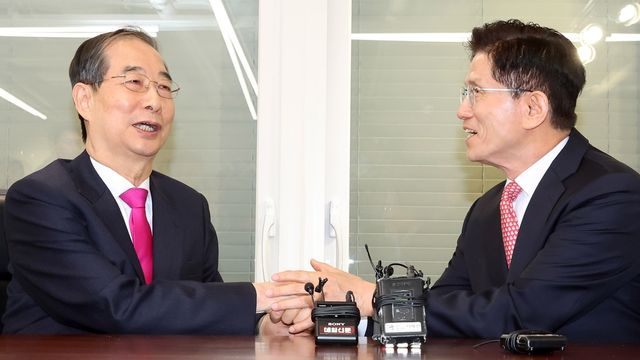 김문수 국민의힘 대선후보와 한덕수 전 국무총리가 지난 11일 서울 여의도 국민의힘 대선후보 사무실에서 회동을 하고 있다. / 뉴스1