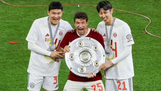 뮐러가 그의 어깨를 다정하게 감싸며 트로피를 가리키자, 김민재는 두 손으로 마이스터샬레를 높이 들었고, 알리안츠 아레나에는 환호와 박수가 터져 나왔다.