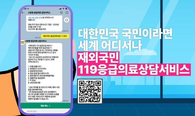 ‘재외국민 119 응급의료상담서비스’는 해외여행자·거주자, 선박 및 항공기의 승무원·승객 등 우리 국민이 해외에서 질병에 걸리거나 다쳤을 때 365일 24시간 소방청 중앙119구급상황관리센터에 상주하는 응급의학전문의를 통해 응급처치 등 응급의료상담을 받을 수 있는 서비스다. 119응급의료상담서비스는 전화, 전자우편, 누리집, 카카오톡(소방청 응급의료상담서비스), 다양한 채널을 통해 서비스를 받을 수 있다.