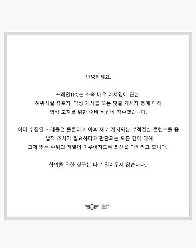 12일 소속사 프레인TPC는 "소속 배우 이세영에 관한 허위사실 유포자, 악성 게시물 또는 댓글 게시자 등에 대해 법적 조치를 위한 준비 작업에 착수했다"라고 알렸다.
