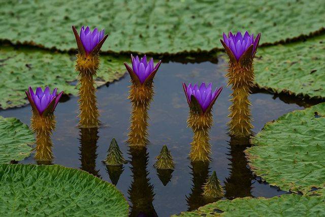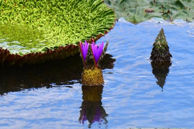가시연꽃의 잎은 최대 2m까지 자라며, 앞면은 광택과 주름이 살아 있는 악어의 등 피부를 연상케 한다. 7~8월 사이 화려한 자색 꽃을 피우고, 전체적으로 날카로운 가시가 덮여 있다. '그대에게 행운을'이라는 꽃말을 지닌 이 식물은 관상 가치도 높은 편이다.