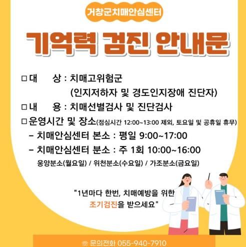 | ▲ 거창군, 인지저하자 및 경도인지장애 진단자 치매조기검진 지원 |