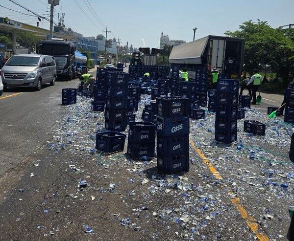 뉴시스 보도에 따르면, 이 사고로 차량에 적재돼 있던 맥주병 1100상자 중 일부가 도로에 떨어지면서 깨진 유리 파편과 맥주가 도로를 뒤덮었다.