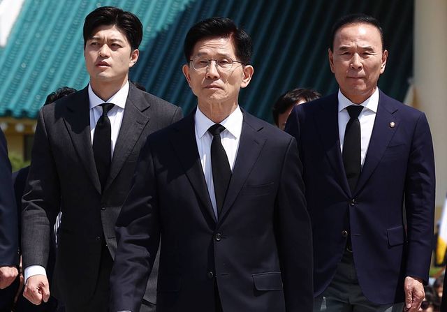 김문수 국민의힘 대통령 후보가 12일 대전 유성구 국립대전현충원 현충탑에서 김용태 비상대책위원장 내정자 등과 참배를 하기 위해 이동하고 있다 / 뉴스1