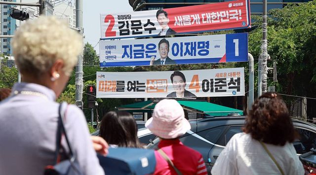 제21대 대통령 선거 공식 선거운동이 시작된 12일 서울 시내 한 거리에 이재명 더불어민주당 대통령 후보와 김문수 국민의힘 대통령 후보, 이준석 개혁신당 대통령 후보의 현수막이 걸려 있다 / 뉴스1