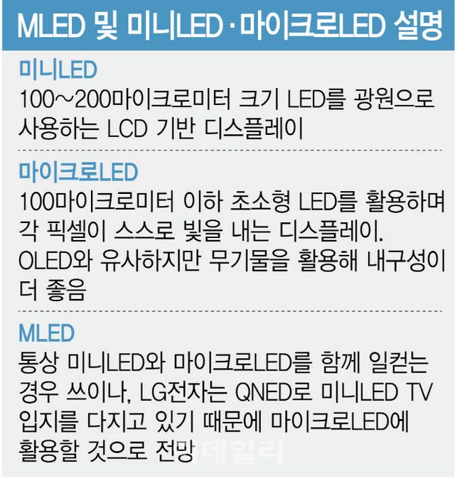 MLED는 업계에서 간간이 거론되지만 아직 제대로 자리 잡지 못한 용어다. MLED는 미니LED와 마이크로LED를 함께 일컫지만 기술적 차이 때문에 보통은 미니LED나 마이크로LED로 구분해 부른다. 미니LED는 100~200마이크로미터(1㎛=100만분의 1m) 크기 LED를 광원(백라이트)으로 사용하는 액정표시장치(LCD) TV인 반면 마이크로LED는 자발광 디스플레이로 광원이 필요 없으며 무기물을 사용해 수명이 길다. 업계에선 궁극적인 디스플레이 기술 목표를 마이크로LED로 보고 있다.