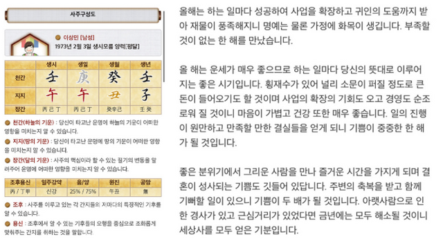 온라인 사주 전문 사이트 '위키사주'는 오랜 전통을 바탕으로 한 사주팔자와 현대적인 분석 기술을 결합하여 각자의 운명을 상세히 분석한다. 이름과 생년월일, 태어난 시간과 성별을 입력하면 간단하게 이용할 수 있다. 특히, 앞으로 3년 동안의 애정을 꿰뚫어볼 수 있는 애정운, 냉정하고 속시원한 궁합, 사랑에 관한 모든 것을 담은 타로까지 다양한 운세를 재미있게 점칠 수 있다.