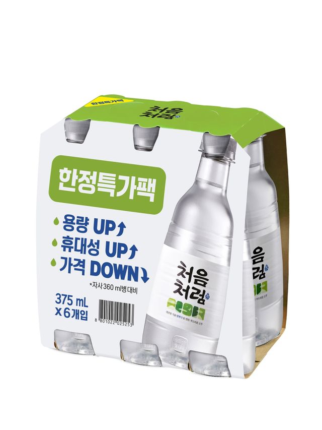페트 소주의 성장 트렌드에 맞춰 새롭게 선보이는 ‘처음처럼 375ml 페트’는 360ml 병 제품 보다 용량은 15ml 증가했음에도 병 제품보다 저렴한 가격의 가성비와 페트 제품 특유의 휴대 편의성이 좋은 특징을 갖고 있다. 우선, 대형마트와 슈퍼마켓에서 6입 패키지 혹은 박스 단위로 한정 판매할 예정이다.