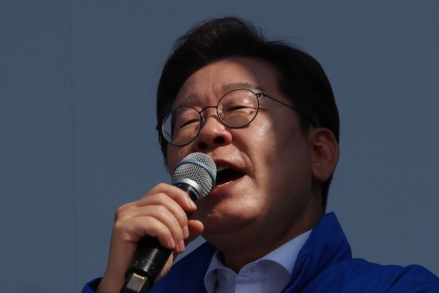 이재명 더불어민주당 대통령 후보가 제21대 대통령 선거 공식 선거운동 첫날인 12일 오후 경기 화성시 동탄 센트럴파크 음악분수중앙광장에서 집중유세에서 연설하고 있다. 자료 사진 / 뉴스1