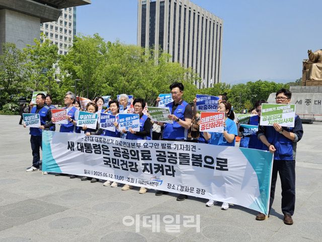 민주노총 공공운수노조 의료연대본부는 12일 오전 서울 광화문광장에서 21대 대통령선거 요구안 발표 기자회견을 진행했다. 의료연대본부는 이 자리에서 대선 정책 요구 사항으로 △공공의료·공공 돌봄 확충 △붕괴위기 지역의료 살리기 대책 △건강보험 보장성 강화로 무상의료 실현 △보건의료 및 돌봄 인력 확충 △의료·돌봄 시장화 정책 폐기 △노동조건 개선과 노동권 강화를 내세웠다.