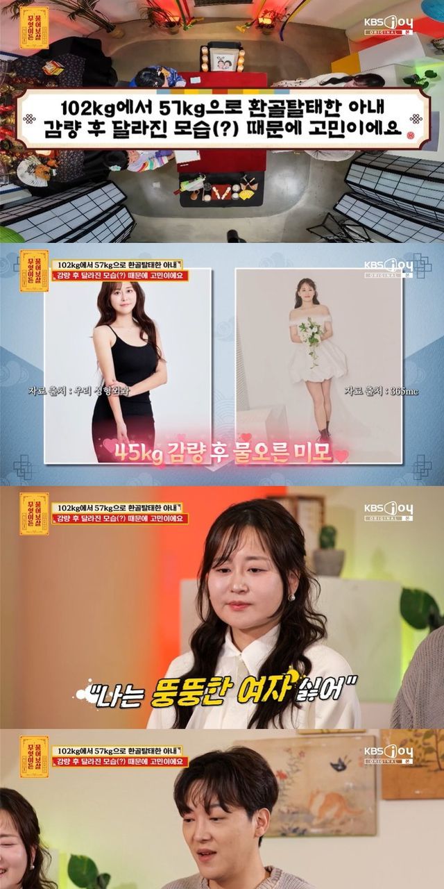 12일 방송된 KBS Joy '무엇이든 물어보살' 316회에는 1년 반 만에 45kg 감량에 성공한 아내가 돌변해 고민이라는 남편이 출연했다.