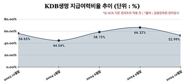 기타포괄손익누계액이 마이너스를 기록한 것은 금융자산의 평가손실 때문이다. KDB생명의 지난해 자본 총계는 613억원으로 전년(3855억월) 대비 84% 감소했다. KDB생명은 지급여력비율(K-ICS·킥스)이 경과 조치에 의한 의존성이 높은 편이다. 2024년 말 기준, KDB생명의 지급여력비율(K-ICS)은 경과조치 적용 후 158.24%로 권고치인 150%를 상회하지만 경과 조치 전의 킥스 비율은 52.99%에 그친다.