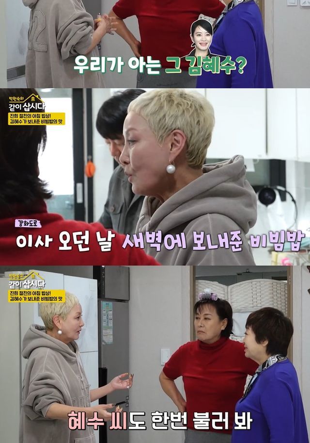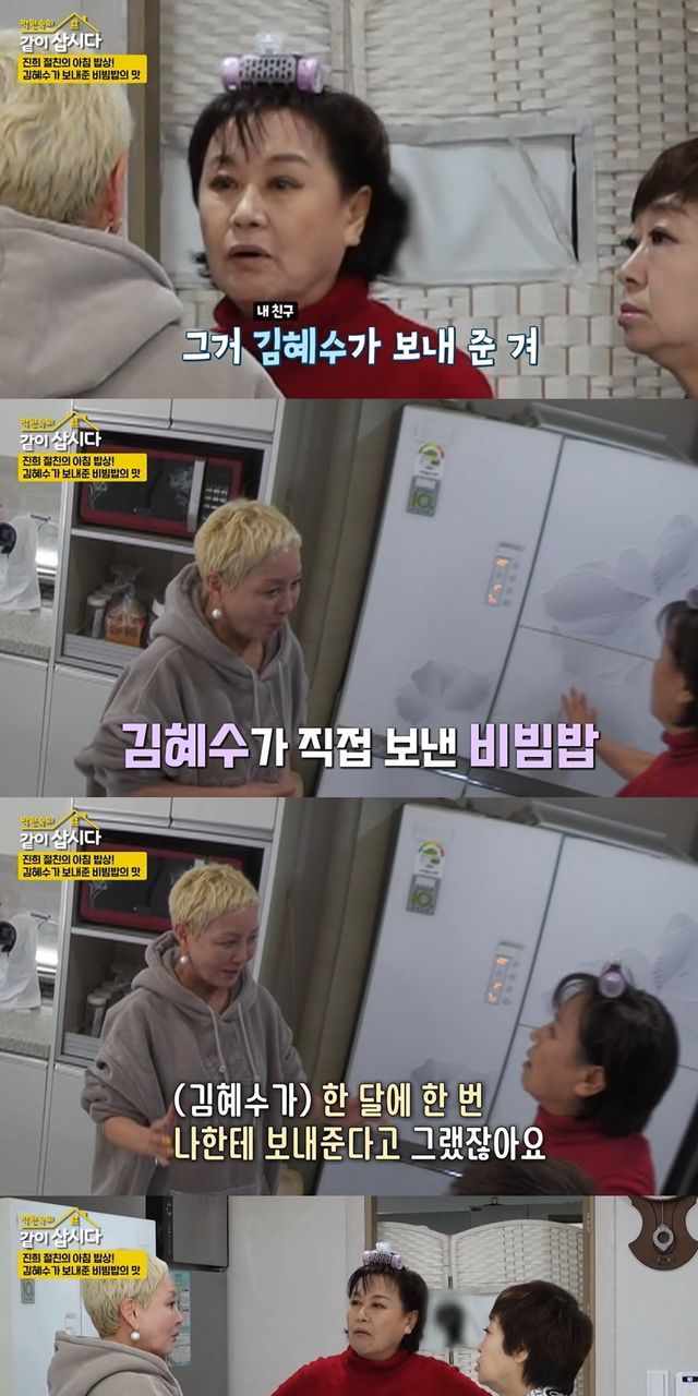 박원숙이 먹은 비빔밥에 대해 홍진희는 "그거 (김)혜수가 보내준 거다"며 "한 달에 한 번씩 나한테 (식료품을) 보내준다고 했지 않냐. 내가 강화도로 오는 날 새벽에 보내줬다"며 배우 김혜수와 30년 넘는 우정을 드러냈다.