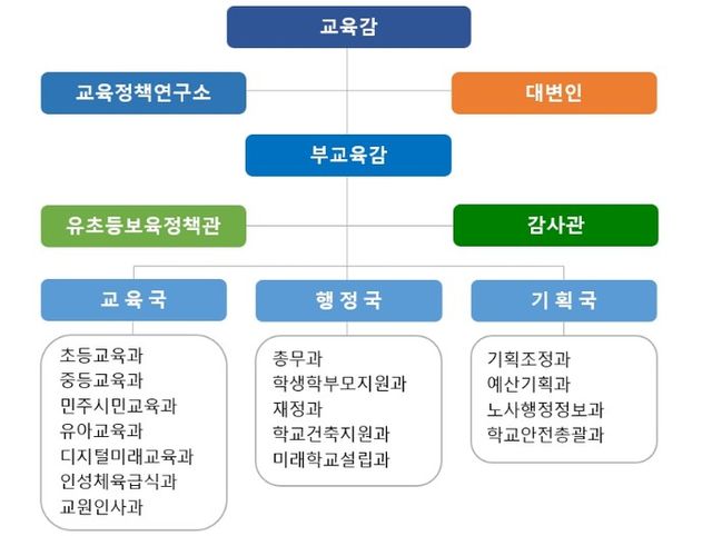 이는 7월(지방공무원)과 9월(교육전문직, 학교장 등)의 정기 인사에 앞서 조직을 정상화하고 공약사항 추진 체계를 마련하기 위한 것이다. 이번 개편으로 시교육청은 3국 3담당관 1연구소 16과 70팀의 직제로 편성・운영된다.