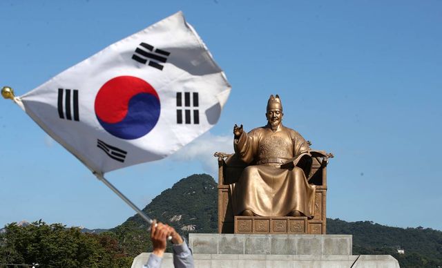서울 세종대로 광화문광장 세종대왕 동상 앞에서 한 시민이 태극기를 흔들고 있다 / 뉴스1