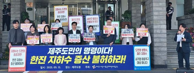 제주시민사회단체연대회의는 13일 제주도청 앞에서 '한진그룹의 먹는샘물 지하수 증산 반대 및 지하수 공수(公水)정책 강화를 위한 기자회견'을 갖고 도민의 생명수인 지하수 사유화를 반대한다는 입장을 밝혔다.