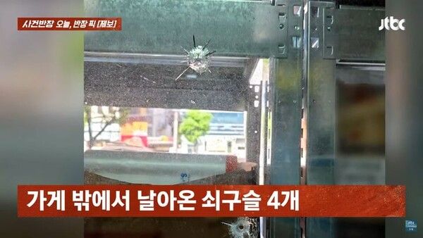 제보자 A씨는 "새벽 시간에 신원 미상의 인물이 가게를 향해 쇠구슬을 4개씩 발사했다"면서 "피해 날짜는 7일과 12일이며, 쇠구슬 때문에 출입문과 전면 유리 등이 파손됐다"고 밝혔다.