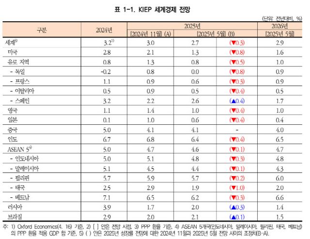 대외경제정책연구원(KIEP)이 13일 발표한 ‘2025년 세계경제 전망(수정)’에 따르면 올해 세계경제 성장률은 2.7%를 기록할 것으로 내다봤다. 작년 11월 발표한 전망치(3.0%)보다 0.3%p(포인트) 낮춰 잡았다. 이는 2000년 이래 닷컴 버블 붕괴(2001년), 글로벌 금융위기(2009년), 코로나19(2020년)를 제외하고 가장 낮은 수치다.