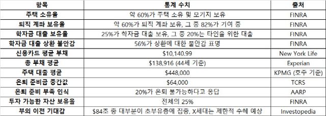 은퇴 준비도 불안하다. X세대의 평균 은퇴자금은 권장액에 한참 못 미치며, 48%가 “노후자금이 부족할 것”이라고 답했다. 미국 사회보장기금 고갈 시점(2033년)이 X세대 은퇴와 겹치면서 연금 삭감 우려도 크다.