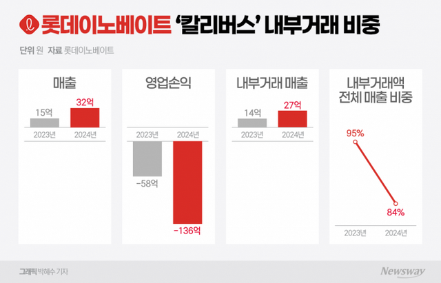 문제는 칼리버스의 내부거래 비중이다. 칼리버스는 2023년 15억 7480만원의 매출을 냈는데, 이 가운데 14억3720억원이 특수관계인에서 나온 내부거래다. 전체 매출의 95%에 달한다. 모회사인 롯데이노베이트는 물론 ▲롯데하이마트 ▲호텔롯데 ▲대흥기획 ▲코리아세븐 등이 매출에 기여했다.