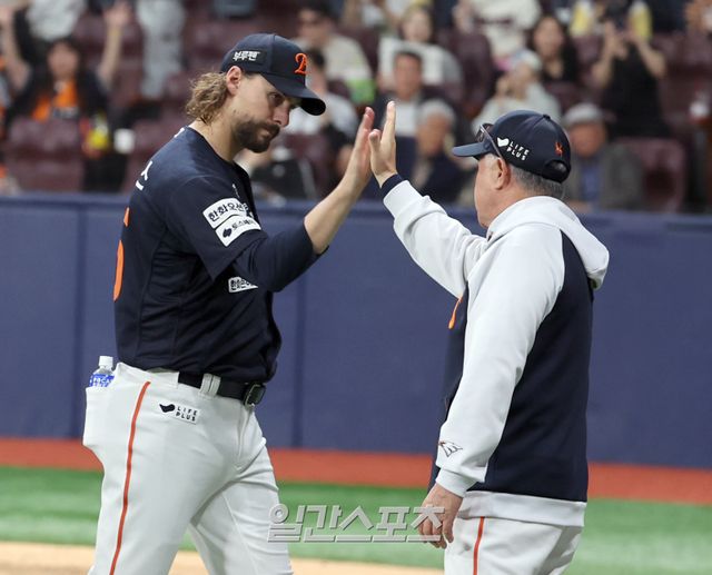 그런데 선뜻 내려가겠다고 했던 와이스의 뜻이 금방 바뀌었다. 서로 절친한 다른 선발진들이 와이스에게 '완봉에 도전하지 않느냐'고 장난쳤던 것. 김경문 감독은 "뒤에서 폰세 등 선수들이 와이스를 놀렸던 것 같다. 그래서 다시 내게 와서 '(9회까지) 던지면 안 될까요?' 하길래 안 된다고 했다"고 웃었다.