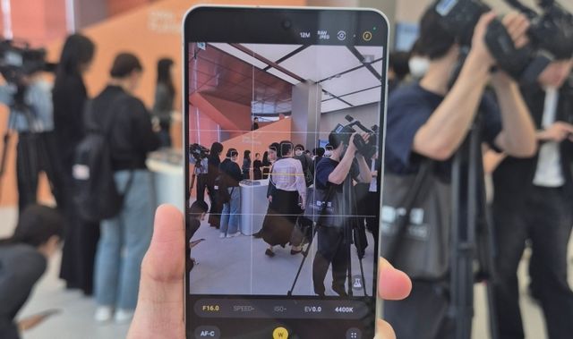 13일 오전 서울 서초구 삼성 강남에서 기자가 갤럭시 S25 엣지 카메라의 F(포커스)값을 16으로 설정 후 촬영하고 있다. (사진=고지혜 기자)