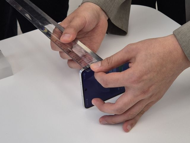 13일 오전 서울 서초구 삼성 강남에서 갤럭시 S25 엣지의 길이를 자로 재고 있다. (사진=고지혜 기자)