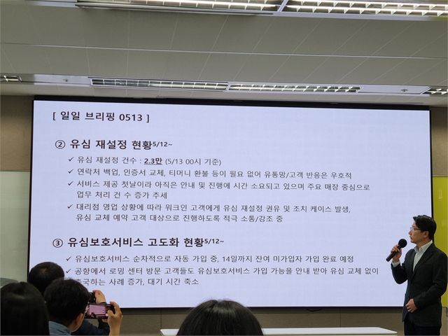 SKT는 13일 미디어 브리핑을 열고 유심 재설정 진행 현황, 향후 영업 재개 계획 등을 설명했다.