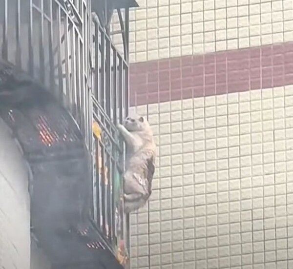 온라인에 떠 도는 영상에는 불이 난 건물의 베란다 난간에 한 고양이가 매달려 있는 모습이 담겨 있다.