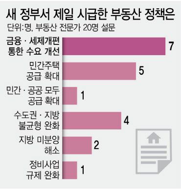 이데일리가 지난 달 말 건설업계·학계·공무원 출신 등 각 분야의 전문가 20명을 대상으로 ‘차기 정부, 부동산 정책 이래야 한다’라는 주제로 설문조사를 실시한 결과 차기 정부에서 가장 시급하게 추진해야 할 정책으로 20명 중 7명이 ‘금융 및 세제개편을 통한 수요 개선’을 꼽았다.