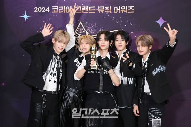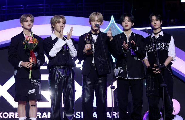 그룹 나우어데이즈가 17일 인천 중구 운서동 인스파이어 아레나에서 열린 '2024 코리아그랜드뮤직어워즈(KGMA)' 둘째날 송 데이에서 IS루키상을 수상하고 소감을 말하고 있다.