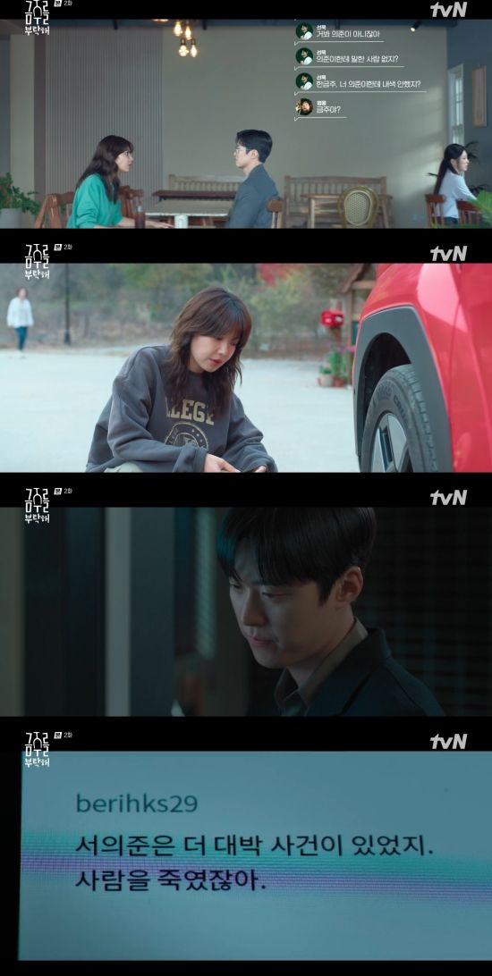 한금주는 "의준아, 나 다 알고 있어. 너 일도 맘대로 안 되고 사랑하는 사람한테도 배신당하고 죽을 만큼 괴로웠다며. 그래서 여기 도망치듯 내려온 거라며. 애써 마음 다독이면서 괜찮은 척 아무렇지도 않은 척 잘 지내는 척하는 거 내 눈에는 다 보인다고"라며 위로했다.