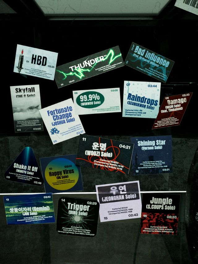 솔로곡 역시 기대를 모은다. 세븐틴이 멤버 전원의 개인곡을 신보에 수록하는 것은 이번이 처음이다. 디에잇의 ‘스카이폴’(Skyfall), 조슈아의 ‘포츄네이트 체인지’(Fortunate Change), 원우의 ‘99.9%’, 승관의 ‘레인드롭스’(Raindrops), 호시의 ‘데미지’(Damage, feat. Timbaland), 민규의 ‘쉐이크 잇 오프’(Shake It Off), 도겸의 ‘해피 바이러스’(Happy Virus), 우지의 ‘운명’, 버논의 ‘샤이닝 스타’(Shining Star), 준의 ‘쌍둥이자리’(Gemini), 디노의 ‘타이거’(Trigger), 정한의 ‘우연’, 에스쿱스의 ‘정글’(Jungle)까지 제목에서부터 멤버들의 개성이 돋보인다.