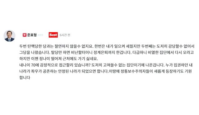 그는 "나이 70에 감정적으로 접근할 리 있나. 도저히 고쳐쓸수 없는 집단이기에 나온 것"이라며 "누가 집권하든 내 나라가 좌우가 공존하는 안정된 나라가 됐으면 한다. 이 땅에 정통 보수주의자들이 새롭게 등장하기도 기원한다"고 했다.