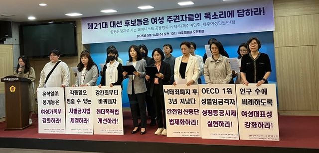 (사)제주여민회, (사)제주여성인권연대는 14일 제주도의회 도민카페에서 기자회견을 열고 "제21대 대선 후보들은 여성 주권자들의 목소리에 답하라"고 목소리를 높였다.