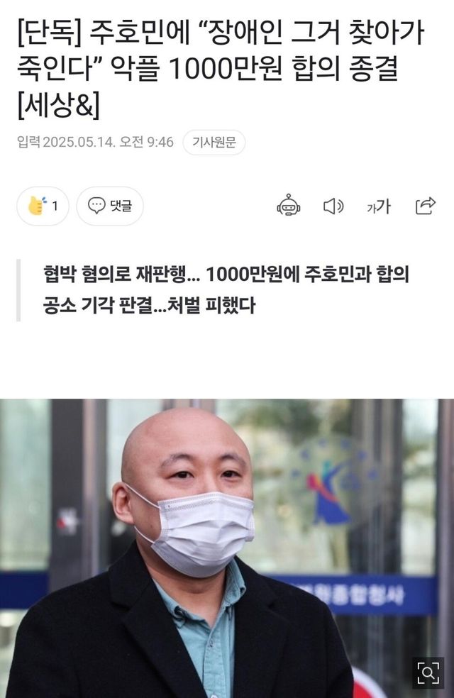 웹툰작가 주호민에게 “장애인 그거 찾아가 죽인다”는 댓글을 남긴 악플러가 합의금 1000만원을 낸 끝에 처벌을 피했다.