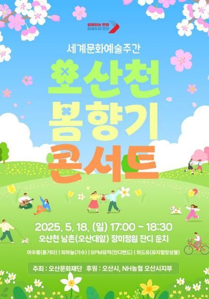 시는 이러한 오산천의 가치를 시민들과 공유하기 위해 다양한 문화·참여 프로그램을 마련했다. 오는 18일에는 남촌 장미정원 잔디둔치에서 '봄향기 콘서트'가 열린다. 자연 속에서 음악을 즐길 수 있도록 총 4팀의 공연이 예정돼 있으며, 시민들이 함께 문화와 소통을 나누는 자리가 될 전망이다.