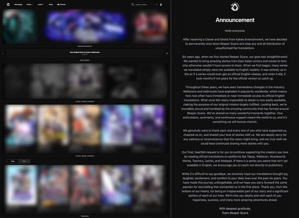 리퍼스캔스 운영진은 9일 웹사이트에 올린 공지문에서 "카카오엔터에서 중단 요청을 받은 후 리퍼스캔스는 불법 번역본의 무단 배포를 전면 중단하고 사이트를 영구적으로 종료하기로 결정했다"며 "마지막으로 간곡한 부탁을 드린다. 공식 플랫폼에서 공식 번역본을 이용함으로써 여러분이 좋아하는 창작자들을 계속해서 응원해 달라"고 적었다.