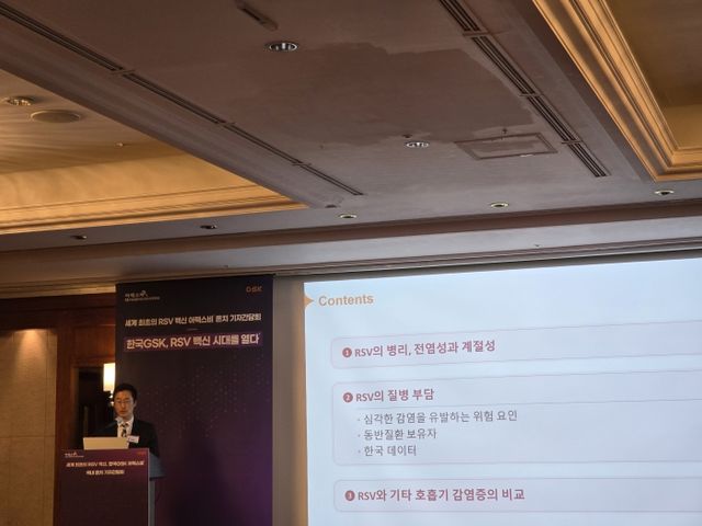 문지용 건국대학교병원 호흡기·알레르기내과 교수가 14일 그랜드 인터컨티넨탈 서울 파르나스 호텔에서 열린 RSV 백신 아렉스비 출시 기념 기자간담회에서 발표하고 있다. 사진=이병현 기자