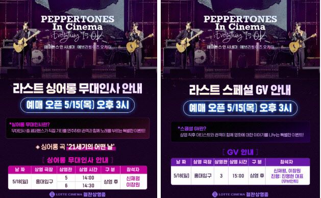 이에 관객들의 폭발적인 반응에 보답하고자, 추가 GV 및 무대인사가 확정됐다. 14일(수) 오늘 오후 7시 롯데시네마 월드타워에서 앵콜 GV가 열리며, 18일(일) 롯데시네마 홍대입구에서는 무대인사 및 GV가 진행될 예정이다. 페퍼톤스가 직접 참석하는 GV와 무대인사는 감사 인사를 넘어, 공연 비하인드와 음악 속 진심을 전하는 특별한 시간이 될 예정이며, 특히 GV에서는 20주년 공연에 담긴 이야기와 노래에 얽힌 감정, 그리고 세트리스트의 의미까지 깊이 있게 나누는 페퍼톤스만의 진정성 있는 소통의 장이 될 것으로 기대된다. 자세한 일정은 롯데시네마 홈페이지와 앱에서 확인 가능하다