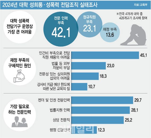 14일 교육부의 ‘2024년 대학 성희롱·성폭력 전담조직 실태조사’에 따르면 전국 대학의 전담조직 설치율은 100%다. 총 478개 대학(대학원대학 등 포함) 중 428개교가 조사에 참여한 결과다. 그러나 전담기구의 실질적 운영은 예산·인력 부족 탓에 발목이 잡힌 상태다.