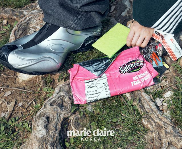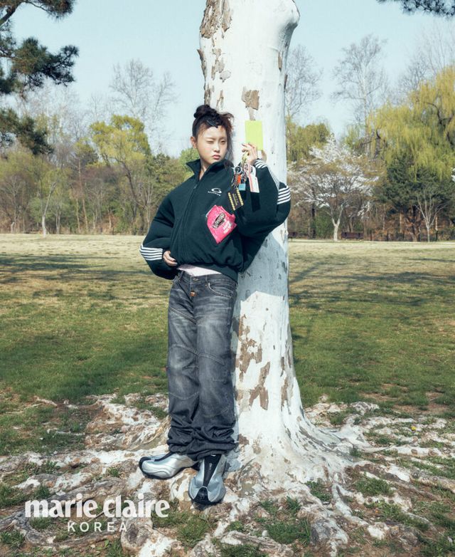 오버사이즈 집업 재킷, 로웨이스트 팬츠, 청키한 스니커즈, 키 링, 클러치 백 모두