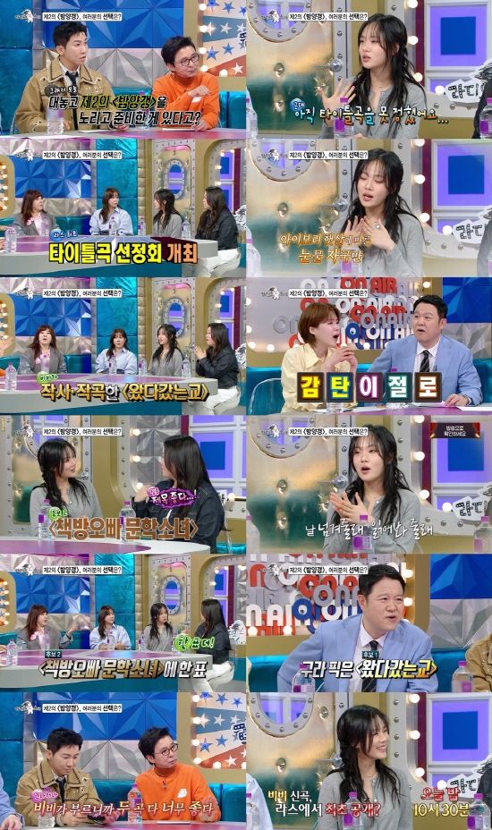 비비는 “아직 새 앨범의 타이틀 곡을 못 정했어요”라며 후보곡으로 ‘왔다갔는교’와 ‘책방오빠 문학소녀’를 공개해 모두의 호기심을 자극한다. 즉석에서 ‘타이틀 곡 선정회’가 펼쳐진 가운데, 비비는 무반주 라이브를 선보인다.