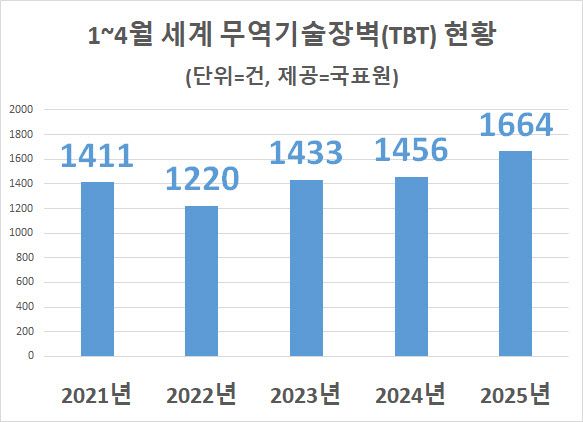 14일 산업통상자원부 국가기술표준원에 따르면 각국이 올 1~4월 세계무역기구(WTO)에 통보한 무역기술장벽(TBT) 건수는 1664건으로 지난해보다 14.3% 늘어난 역대 최대치를 기록했다.