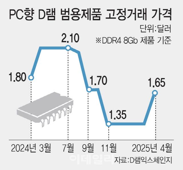 14일 시장조사업체 D램익스체인지에 따르면 D램 고정거래가격은 4월을 기점으로 올랐다. 4월 PC용 DDR4 8기가비트 (DDR4 8Gb 1Gx8) 가격은 전월 대비 22.22% 상승했다. 지난해 11월 D램 가격이 1.45달러로 전월 대비 20% 이상 떨어진 이래 보합세를 유지했던 가격이 오른 것이다. 지난 2021년 4월 이후 4년 만에 가장 큰 폭의 오름세다. DDR5 D램 모듈 가격 역시 6.02~8.24% 상승했다.