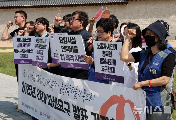 이어 오전 10시에는 공공운수노조 사회서비스협의회가 광화문 월대 앞에서 '새로운 돌봄사회를 위한 사회복지·돌봄노동자 대선 요구 발표 기자회견'을 개최했다.